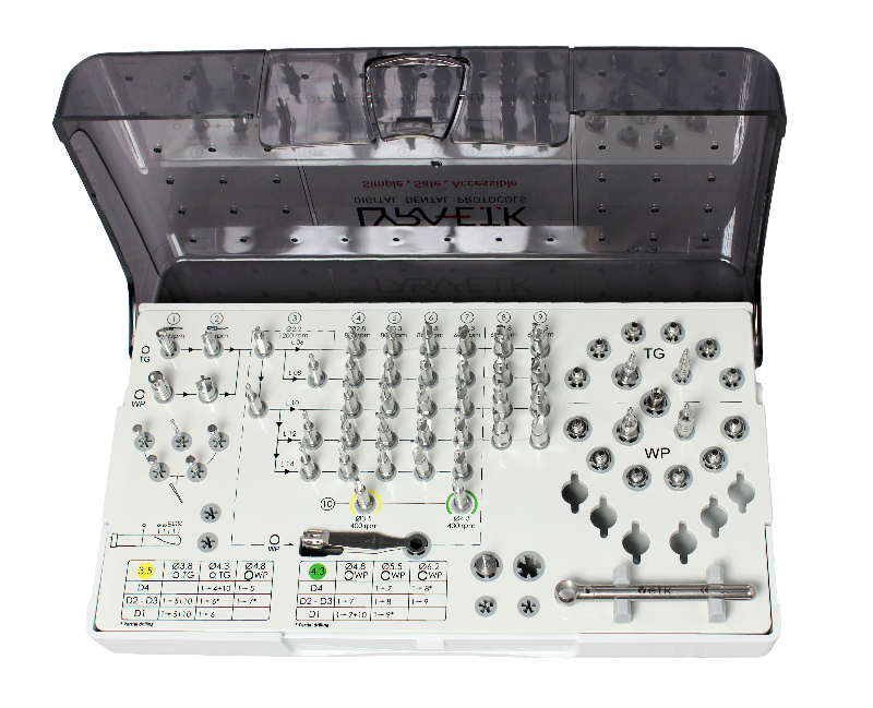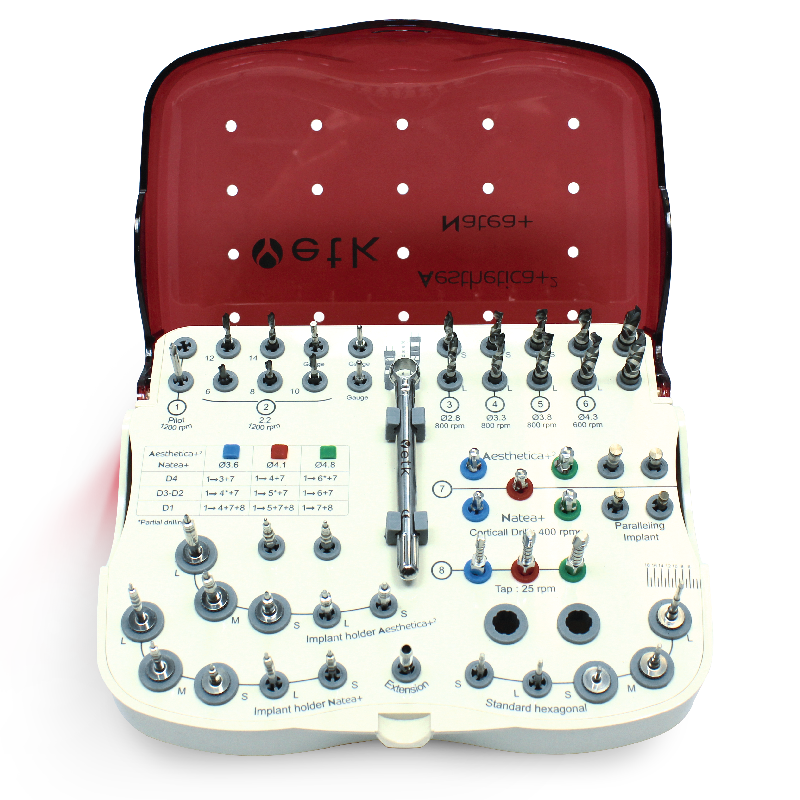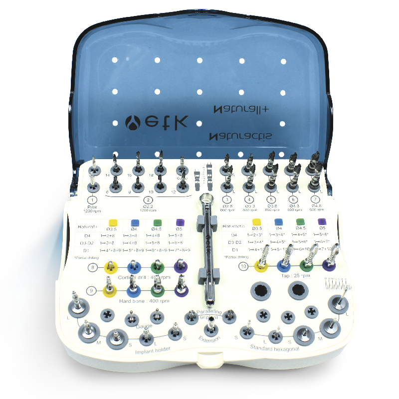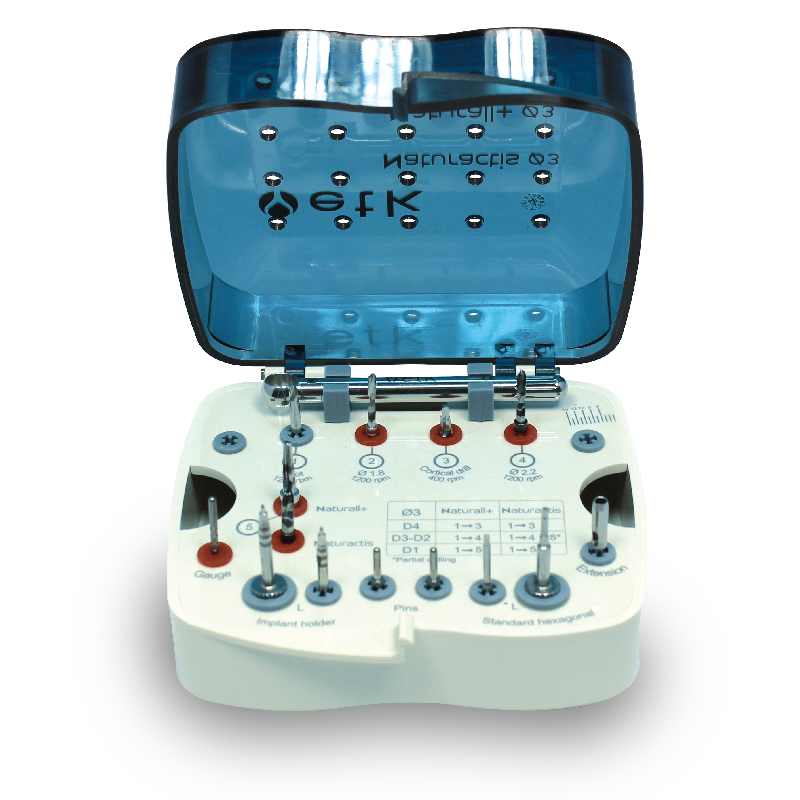 Toutes nos trousses de chirurgie sont conçues pour optimiser la précision et l'efficacité lors des interventions chirurgicales implantaires. Elles présentent plusieurs caractéristiques qui facilitent le travail des chirurgiens dentistes tout en garantissant des résultats de haute qualité pour les patients : des tableaux de protocoles codifiés, des forets numérotés avec une illustration des instruments, un code couleur selon les diamètres d'implants et un réglet gradué.