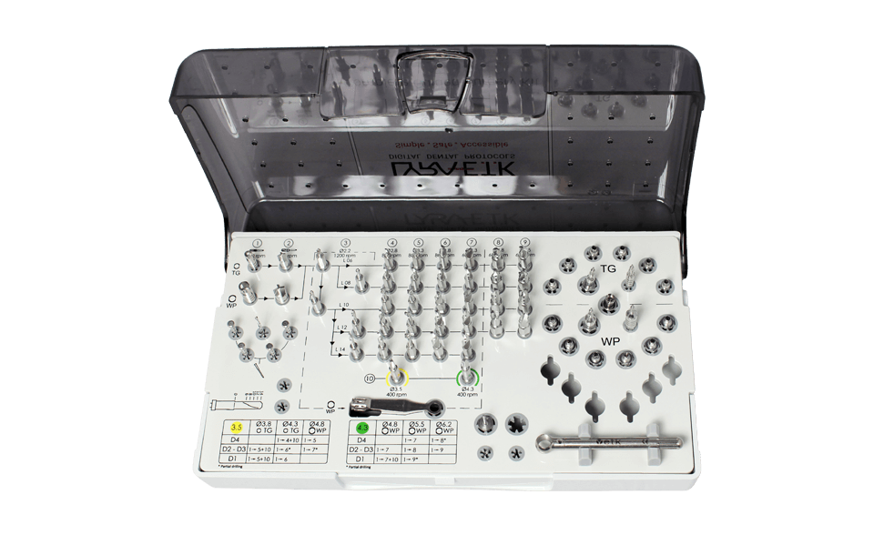 Todos nuestros kits quirúrgicos están diseñados para optimizar la precisión y la eficiencia durante las intervenciones quirúrgicas implantológicas. Presentan varias características que facilitan el trabajo de los odontólogos y garantizan resultados de alta calidad para los pacientes: tablas con protocolos codificados, fresas numeradas con ilustraciones de los instrumentos, un código de colores según el diámetro de los implantes y una regla graduada.