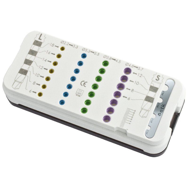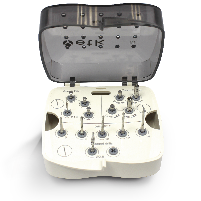 Todos nuestros kits quirúrgicos están diseñados para optimizar la precisión y la eficiencia durante las intervenciones quirúrgicas implantológicas. Presentan varias características que facilitan el trabajo de los odontólogos y garantizan resultados de alta calidad para los pacientes: tablas con protocolos codificados, fresas numeradas con ilustraciones de los instrumentos, un código de colores según el diámetro de los implantes y una regla graduada.
