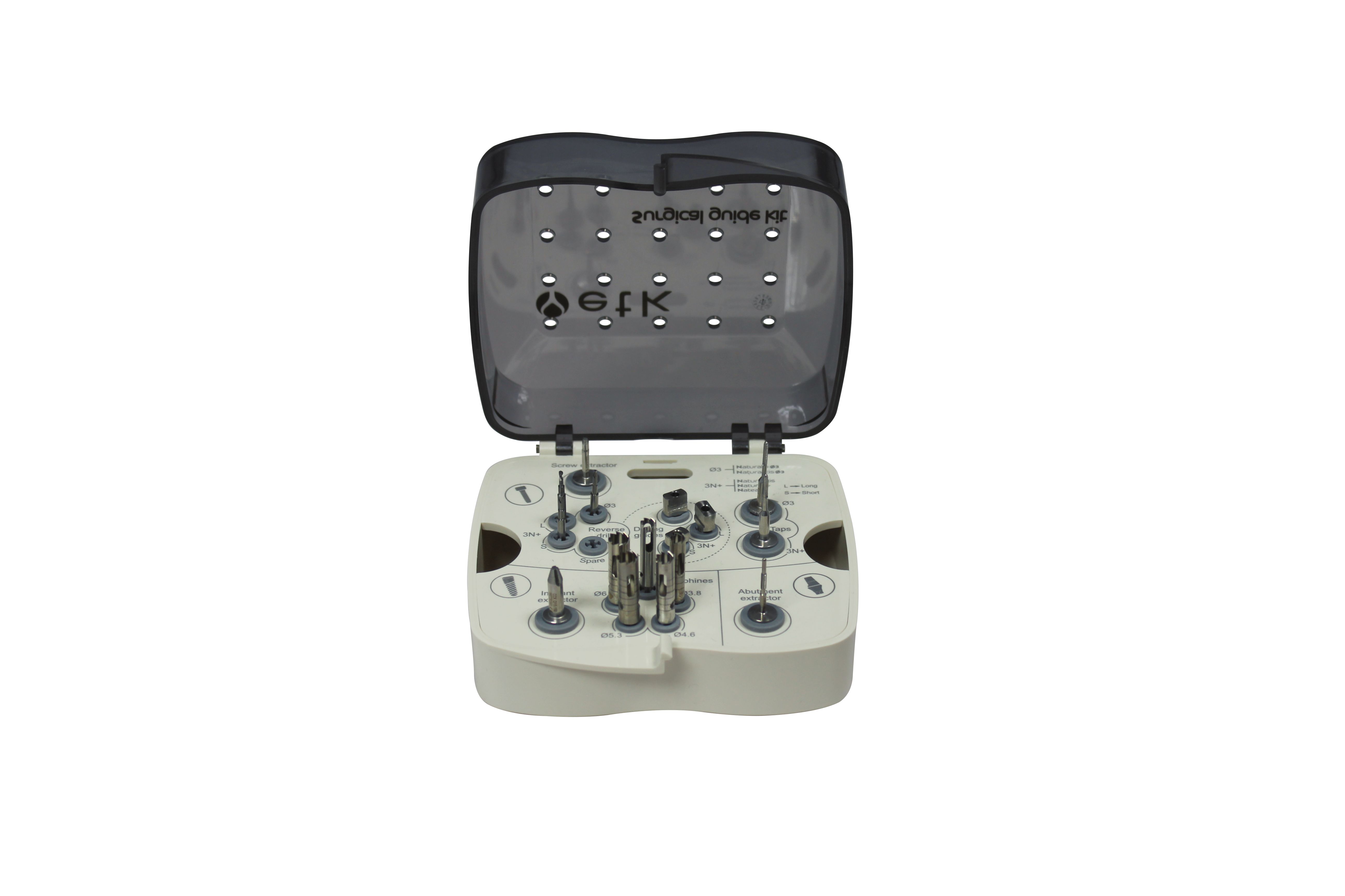 Tutti i nostri kit chirurgici sono progettati per massimizzare la precisione e l'efficienza durante la chirurgia implantare. Presentano diverse caratteristiche che facilitano il lavoro dei chirurghi odontoiatri, garantendo al contempo risultati di alta qualità per i pazienti: tabelle di protocollo codificate, frese numerate con illustrazioni degli strumenti, codifica a colori in base al diametro dell'impianto e un righello graduato.
